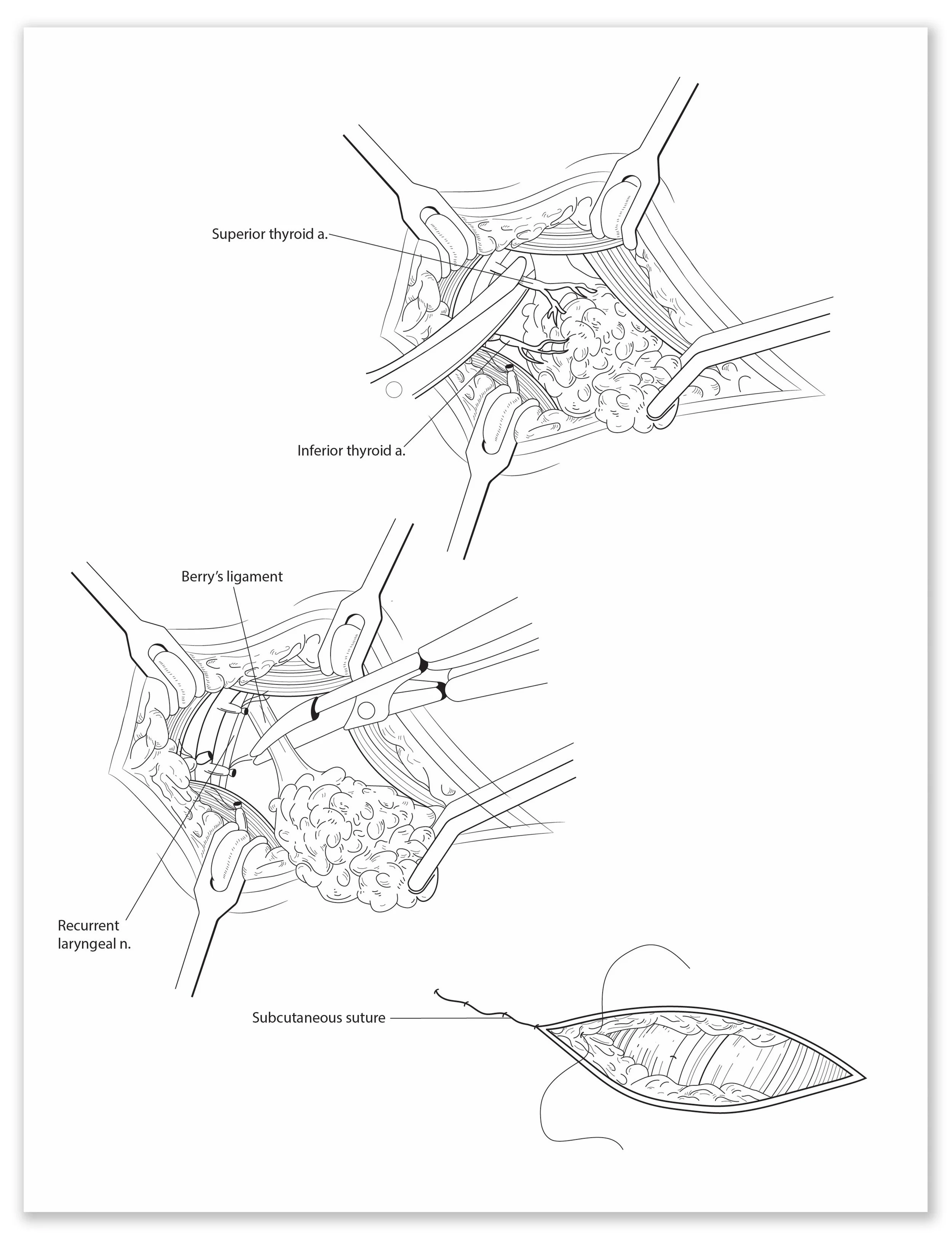 Description: This surgical illustration depicts the key procedural steps in a total thyroidectomy.
